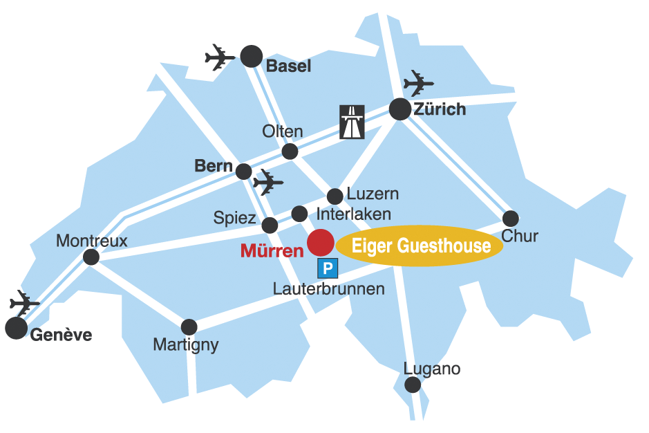 Das autofreie Mürren erreichen Sie entweder mit der BLM ab Lauterbrunnen (Parkhaus bei der Bahnstation) oder mit der Schilthornbahn ab Stechelberg (grosser Parkplatz). Das Eiger Guesthouse liegt direkt gegenüber der BLM Bahnstation. Fahrpläne unter: www.sbb.ch